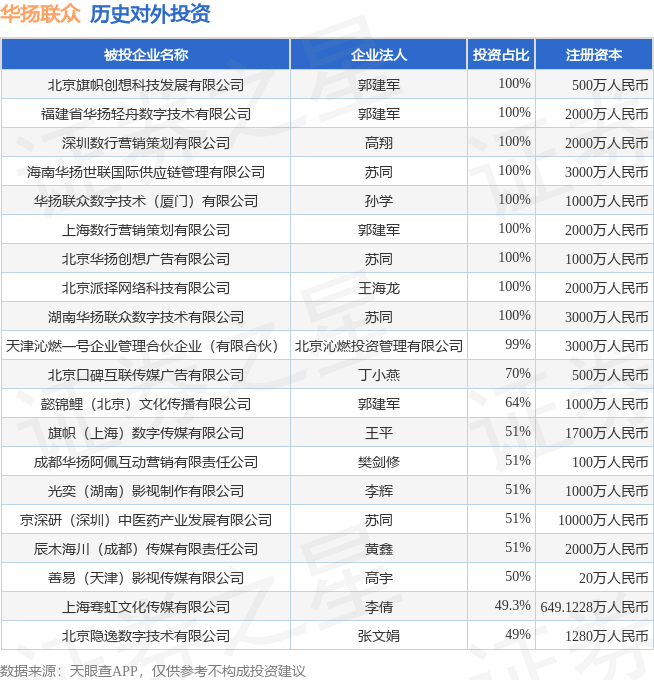 本站消息涨中宝,根据天眼查APP显示,华扬联众(603825)新增一起对外投资事件,被投资公司为光奕(湖南)影视制作有限公司,法定代表人李辉,投资占比为51%。该公司从事广播、电视、电影和录音制作业,注册资本为1000万人民币。目前,华扬联众共存在对外投资40项,投资占比前20的项目见下表: