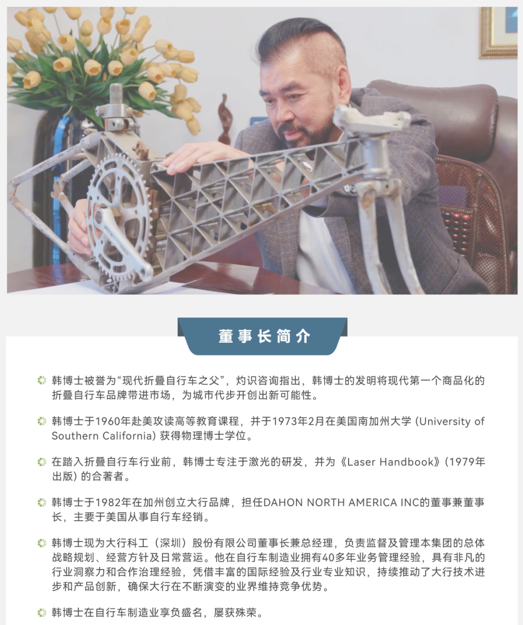 大行科工主营折叠自行车,公司董事长韩德玮曾在美国南加州大学获物理博士学位点石策略,并专注于激光领域研究。1982年,韩德玮创业建立“大行”品牌,现年83岁的他仍奋斗在大行科工经营管理一线,行业称其为“现代折叠自行车之父”。