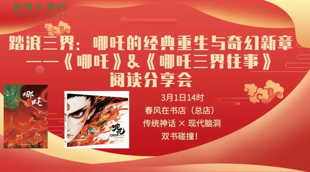 他是陈塘关的英雄少年,天生神力,手持风火轮和混天绫,英勇无敌。他性格勇敢、叛逆,不畏强权,故事传遍四海,深受人们喜爱——他就是中国文化中的传奇英雄“哪吒”。3月1日,春风在书店邀您一起阅读关于哪吒的两本经典畅销书籍:《哪吒》&《哪吒三界往事》,带领大家深入剖析这两本佳作,从哪吒闹海的英勇无畏,到其在三界的传奇经历,一同感受神话故事的魅力。