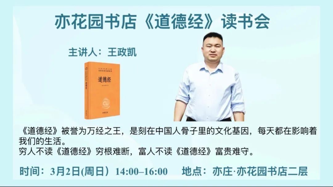 在忙碌的生活中,你是否渴望一方宁静的精神家园,探寻古老智慧的深邃力量?《道德经》作为中国哲学的瑰宝,简洁而深刻的文字,蕴含着无尽的人生哲理和处世之道。3月2日,在亦花园书店二层,一杯清茶,一本好书,让我们一起探寻人生智慧,领略经典的魅力。