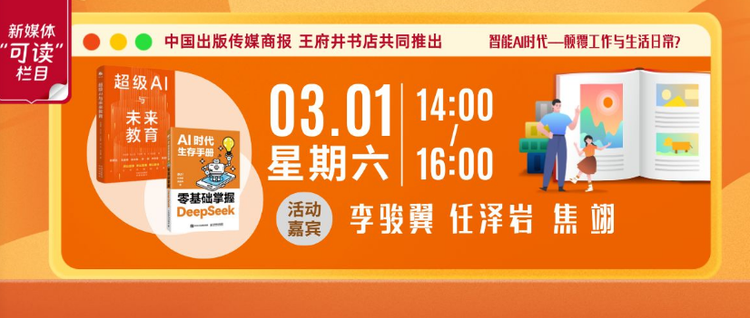 由中国出版传媒商报、王府井书店共同推出的新媒体直播阅读栏目“可读”,将以实体书店为场景推送阅读、对谈活动。本周六,栏目第三期主题“智能AI时代,颠覆工作与生活日常”,将为线上读者邀请未来教育跨界研究者、中国教育三十人论坛特约研究员李骏翼,秋叶集团AI独家讲师、工信部中国电子学会高级AIGC提示词工程师任泽岩,两位嘉宾将与记者焦翊展开对谈,带您深入探索AI如何重塑我们的世界。