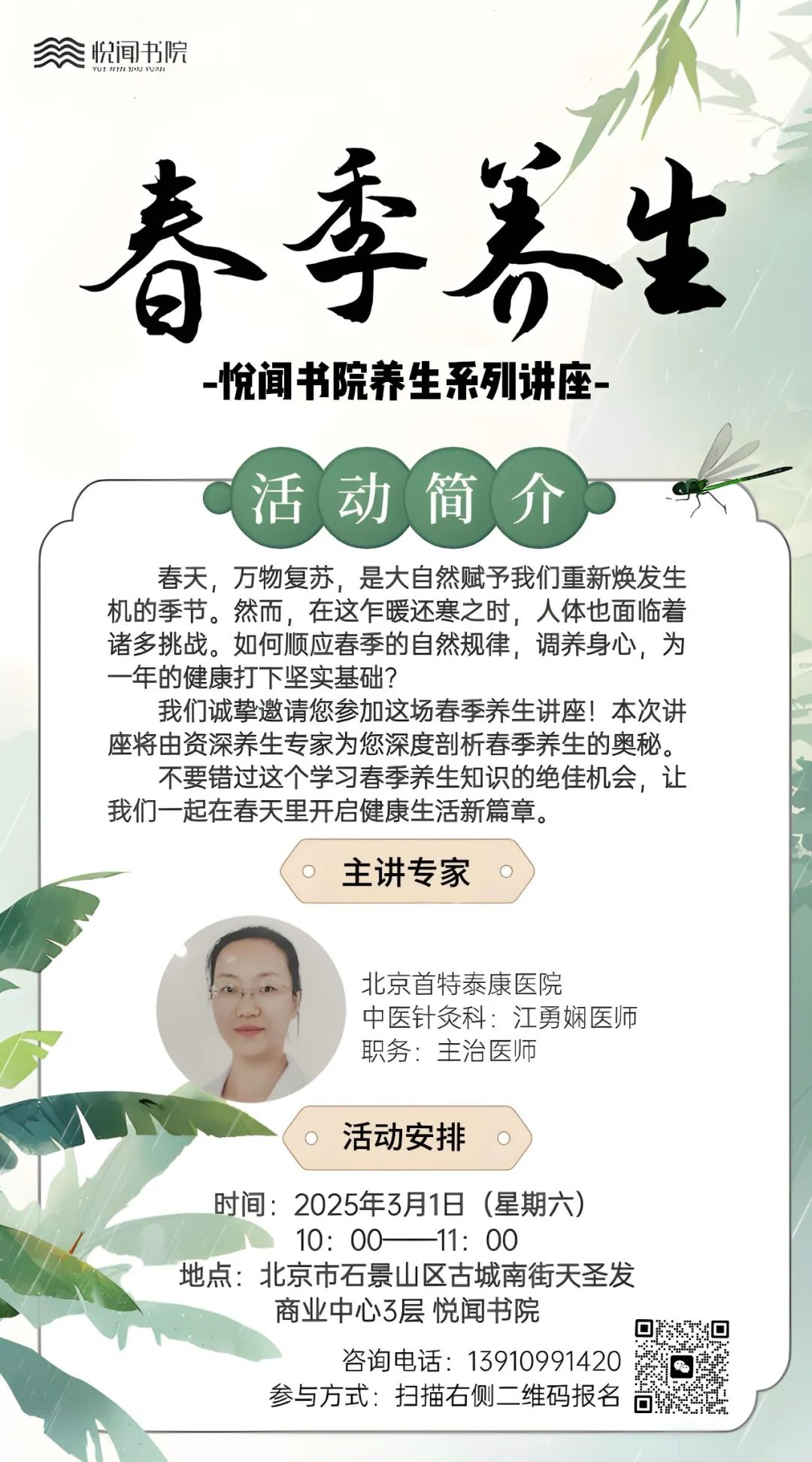 春天,万物复苏,然而在换季时,人体也面临着诸多挑战。如何顺应春季的自然规律,调养身心,为一年的健康打下坚实基础?悦闻书院诚挚邀请您参加这场春季养生讲座,本次讲座将由资深专家为您深度剖析春季养生的奥秘,不要错过这个学习春季养生知识的绝佳机会,让我们一起在春天里开启健康生活新篇章。