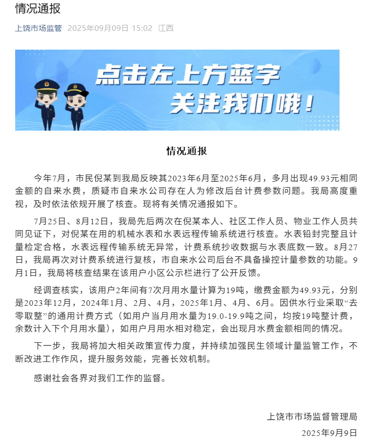 今年7月,市民倪某到我局反映其2023年6月至2025年6月,多月出现49.93元相同金额的自来水费,质疑市自来水公司存在人为修改后台计费参数问题。我局高度重视,及时依法依规开展了核查。现将有关情况通报如下。